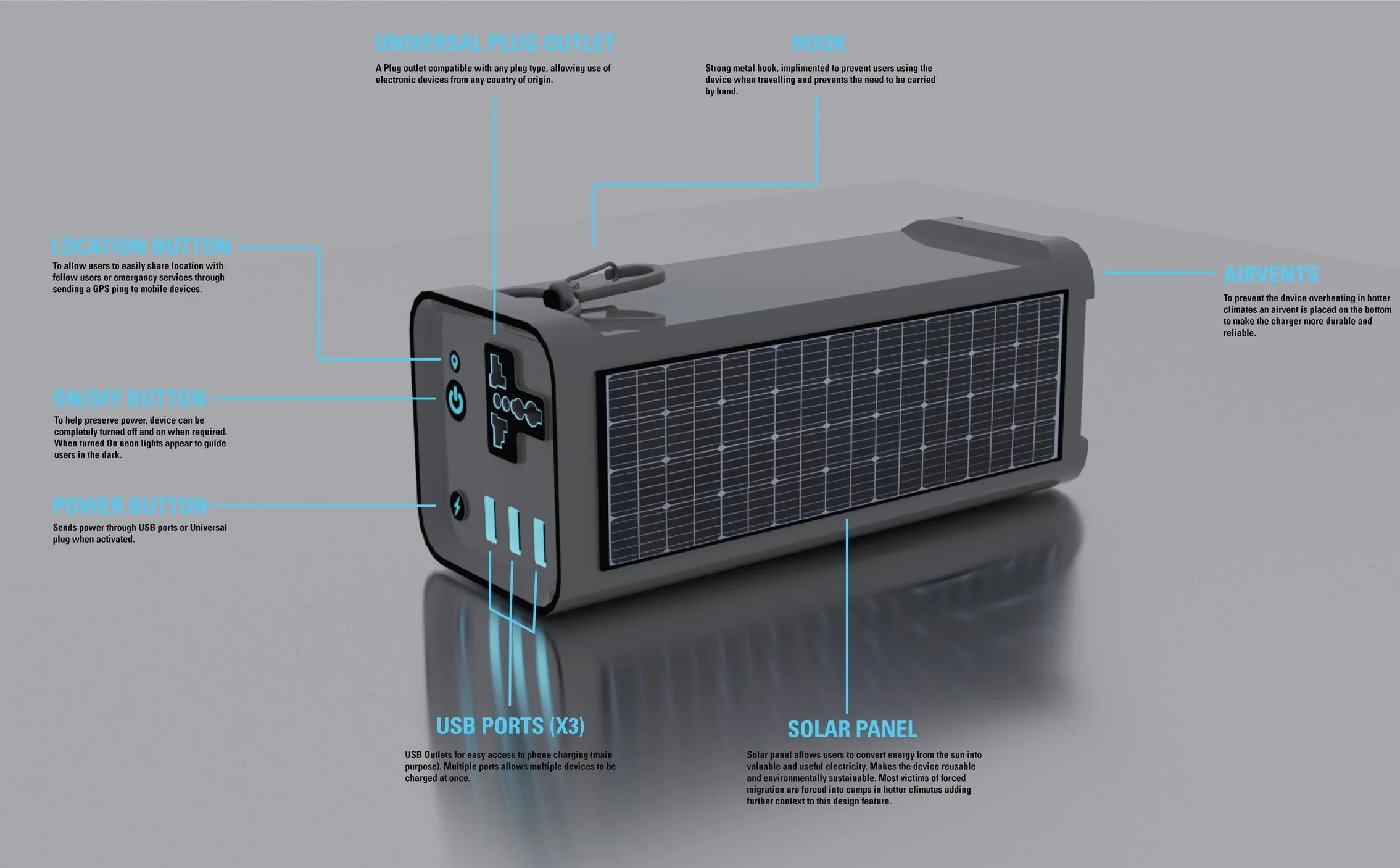 For this project I was briefed to conceptualise a charitable campaign that helps victims of forced migration across the world. After researching in more depth the everyday challenges migrants face I concluded the most valuable donation to them would be charge for their phones, so they can stay in contact with loved ones and call for help if necessary. I chose to pursue a collaboration with Unicef and Google and designed a portable charger (manufactured & engineered by google) that would be distributed across migration camps and given to families (By Unicef). When designing the device I included features to make it easy to use and sustainable across different climates.
